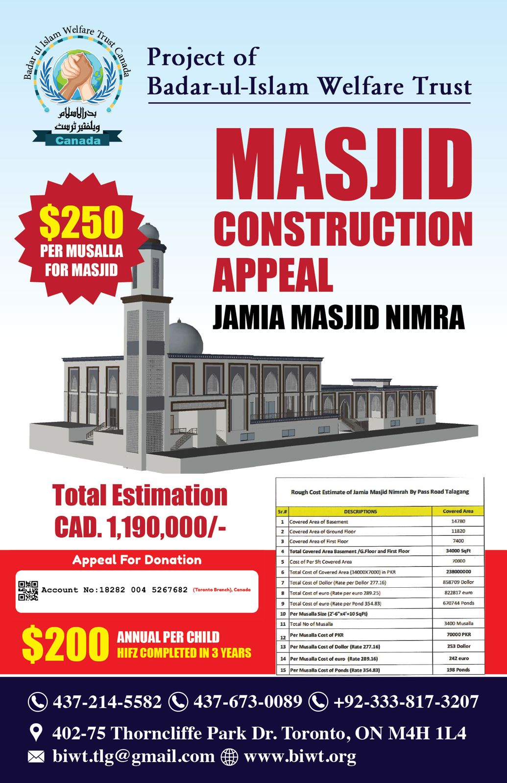 We are embarking on a heartfelt initiative to construct a madrasa for free education and a mosque to serve our community’s spiritual and educational needs. Total estimation is CAD. 6189431/-. The madrasa will provide a safe and inclusive environment for students to receive quality education in both religious and secular subjects, empowering them with knowledge and values for a brighter future. Alongside this, the mosque will be a sanctuary for worship and community gatherings, fostering unity and spiritual growth. To bring this vision to life, we are seeking generous donations from individuals and organizations who believe in the transformative power of education and faith. Your support will help us create a lasting legacy of learning and spirituality, benefiting generations to come. Every contribution, no matter the size, will make a meaningful difference. Together, let’s build a brighter future!